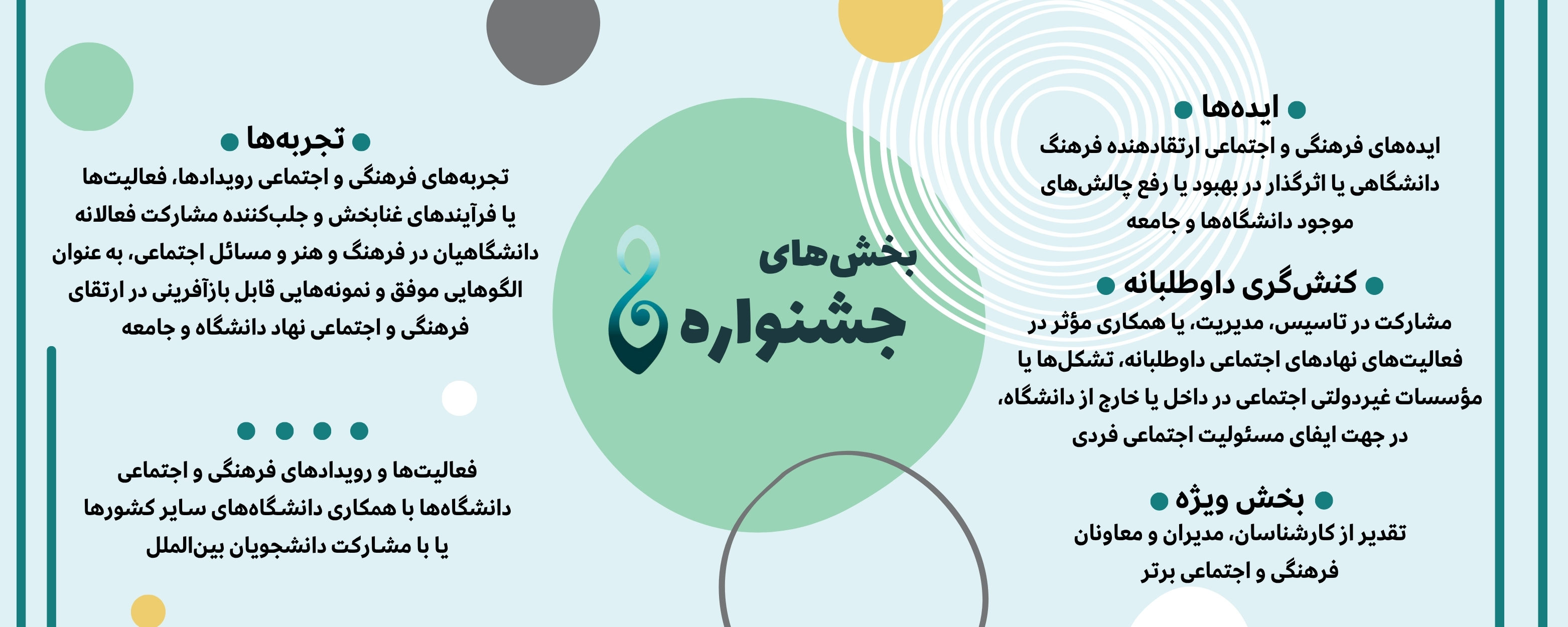 🔶 محورهای جشنواره: ایدهها، تجربهها، کنشگری داوطلبانه و بخش ویژه: تقدیر از کارشناسان، مدیران و معاونان برتر فرهنگی و اجتماعی.